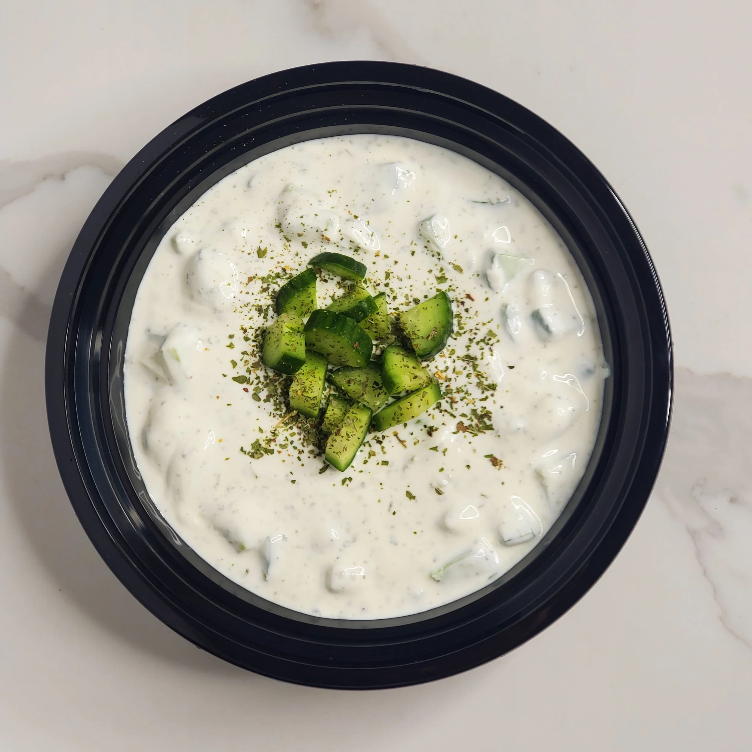 Creamy strained yogurt dip blended with cucumber and mint flakes